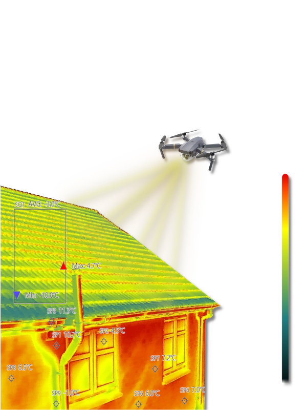 Thermal heat loss detection is a process in which a thermal camera mounted on a drone is used to capture infrared images of a building's exterior. These images are then analyzed to identify areas where heat is escaping, which can indicate areas of poor insulation or other issues such as damp and leaks that may be causing energy loss. Using a drone for thermal heat loss detection allows for a safe, quick, cost-effective, and non-intrusive method of identifying heat loss issues in hard-to-reach areas, including rooftops and upper floors and windows It can also provide a comprehensive view of the building's exterior, making it easier to identify patterns or areas of concern.